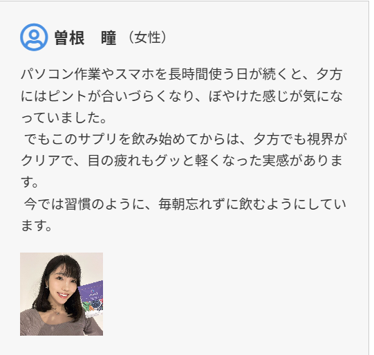 パソコン作業やスマホを長時間使う日が続くと、夕方にはピントが合いづらくなり、ぼやけた感じが気になっていました。 でもこのサプリを飲み始めてからは、夕方でも視界がクリアで、目の疲れもグッと軽くなった実感があります。 今では習慣のように、毎朝忘れずに飲むようにしています。